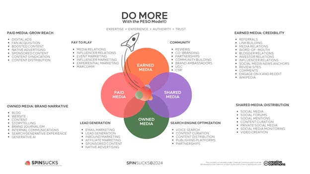 The PESO Model originally developed by Gini Dietrich of Spin Sucks, has become the industry standard for modern PR strategies because it ensures that brands aren’t relying on just one channel to tell their story. Instead, they strategically distribute content across multiple platforms for greater reach and higher ROI.